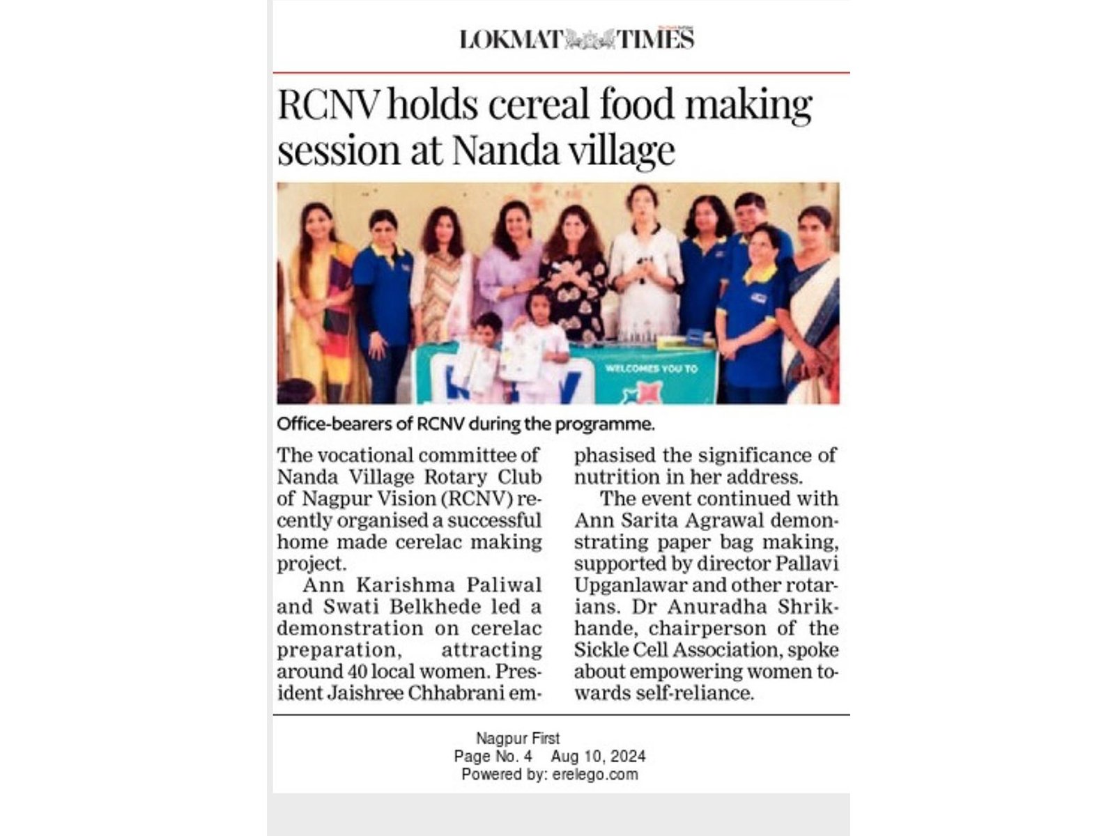 The event continued with Ann Sarita Agrawal demon- strating paper bag making, supported by director Pallavi Upganlawar and other rotar- ians. Dr Anuradha Shrik- hande, chairperson of the Sickle Cell Association, spoke about empowering women to- wards self-reliance.